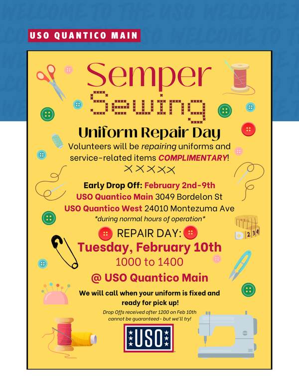📦 Early Drop Off: Feb 2nd–9th (during normal hours at both centers) 🪡 Repair Day: Tuesday, Feb 10th | 1000–1400 📍 USO Quantico Main on Marine Corps Base Quantico