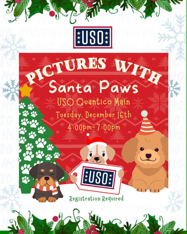 We’re rolling out the red carpet for our four-legged family members! 🐾❤️ Join us at USO Quantico Main on December 16th for Photos with Santa Paws. Be sure to register—can’t wait to see those holiday smiles (and tail wags)! 🎄📸