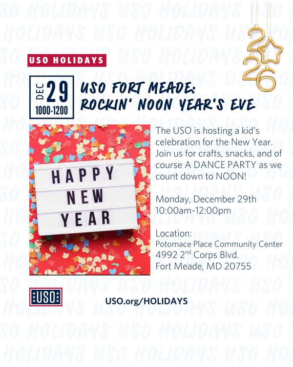 The USO is hosting a kid’s celebration for the New Year. Join us for crafts, snacks, and of course A DANCE PARTY as we count down to NOON!