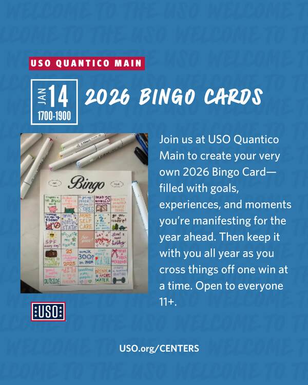 Join us at USO Quantico Main to create your very own 2026 Bingo Card—filled with goals, experiences, and moments you’re manifesting for the year ahead. Then keep it with you all year as you cross things off one win at a time. Registration required, open to everyone 11 years old and up.