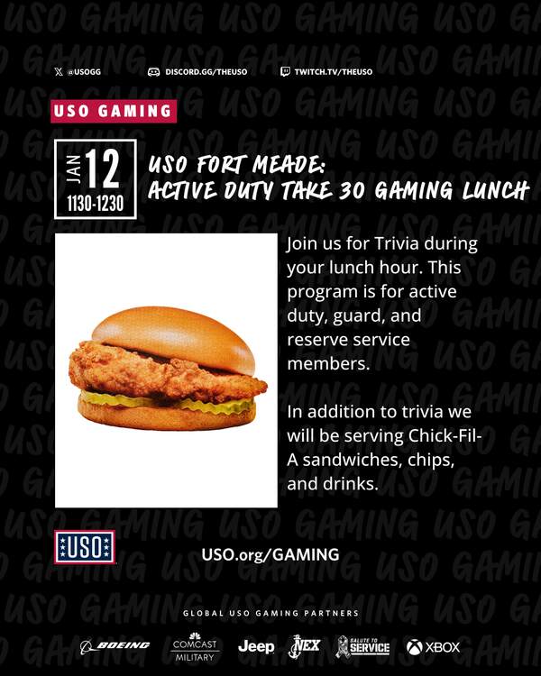 We invite Active Duty service members to “take 30” and join us for Trivia/games and Chick-Fil-A Sandwiches. Event starts at 11:30am and runs through 12:30pm or while supplies last.